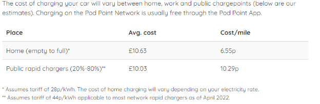 The sole use of home 7kwh charging whilst minimising total charge costs, does not reflect real life use where charging on route or at destination using faster chargers is estimated to occur for 30% of charge cycles[3]. Charging whilst at work does make sense. Third-party chargers’ tariffs ranged from 0.42 pkwh for fast and 0.64pkwh for ultra-fast (September 2022) to 0.61pkwh and 0.74pkwh respectively (October 2022)[4]. Quicker charge times do increase cost by up 40% as evidenced in Pod Points April 2022 summary comparison noted below (£10.29 vs £6.55).