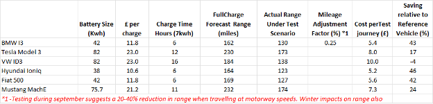 In the absence of long-term test data, the impact of battery range performance during colder temperatures is difficult to assess with accuracy. Between each of the 3-test periods, my own EV suggests that it has 25% less range in October than during the warm summer estimates (July) as a result of temperature change.[2] It is assumed that this charge loss will increase as the temperatures continue to drop in the UK winter. A review online suggests loss of capacity up to 40% is not uncommon and is therefore a factor for consideration for up to 6 months of the year in the UK. A range adjustment factor of -25% has therefore been applied equally to all EVs assessed.