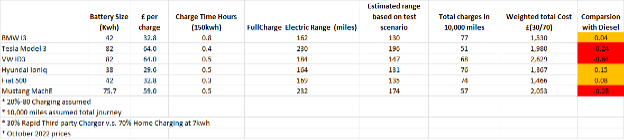 EV performance data was initially extracted from Pod Point (EV charger supplier)[1] and their vehicle real life vehicle performance assessments. It is not clear from their testing what the combination of urban rural driving they used or at what time of the year the testing took place. The diesel test vehicle is long term ownership. I hired and bought the other EV model used in the test and considered anecdotal feedback from other EV owners.